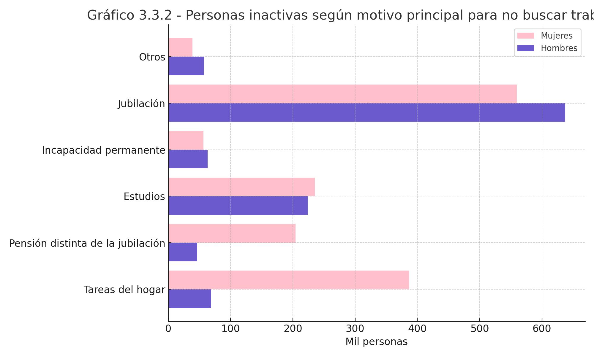 Otro indicador pone de manifiesto la desigualdad entre mujeres y hombres respecto a la inactividad por razones relacionadas con las tareas del hogar y por pensiones diferentes a la jubilación, que recaen específicamente en las mujeres. De entre las personas inactivas a causa de las tareas del hogar, el 85% son mujeres, y de entre las personas inactivas por pensiones distintas a la jubilación, las mujeres representan el 81,5%.
