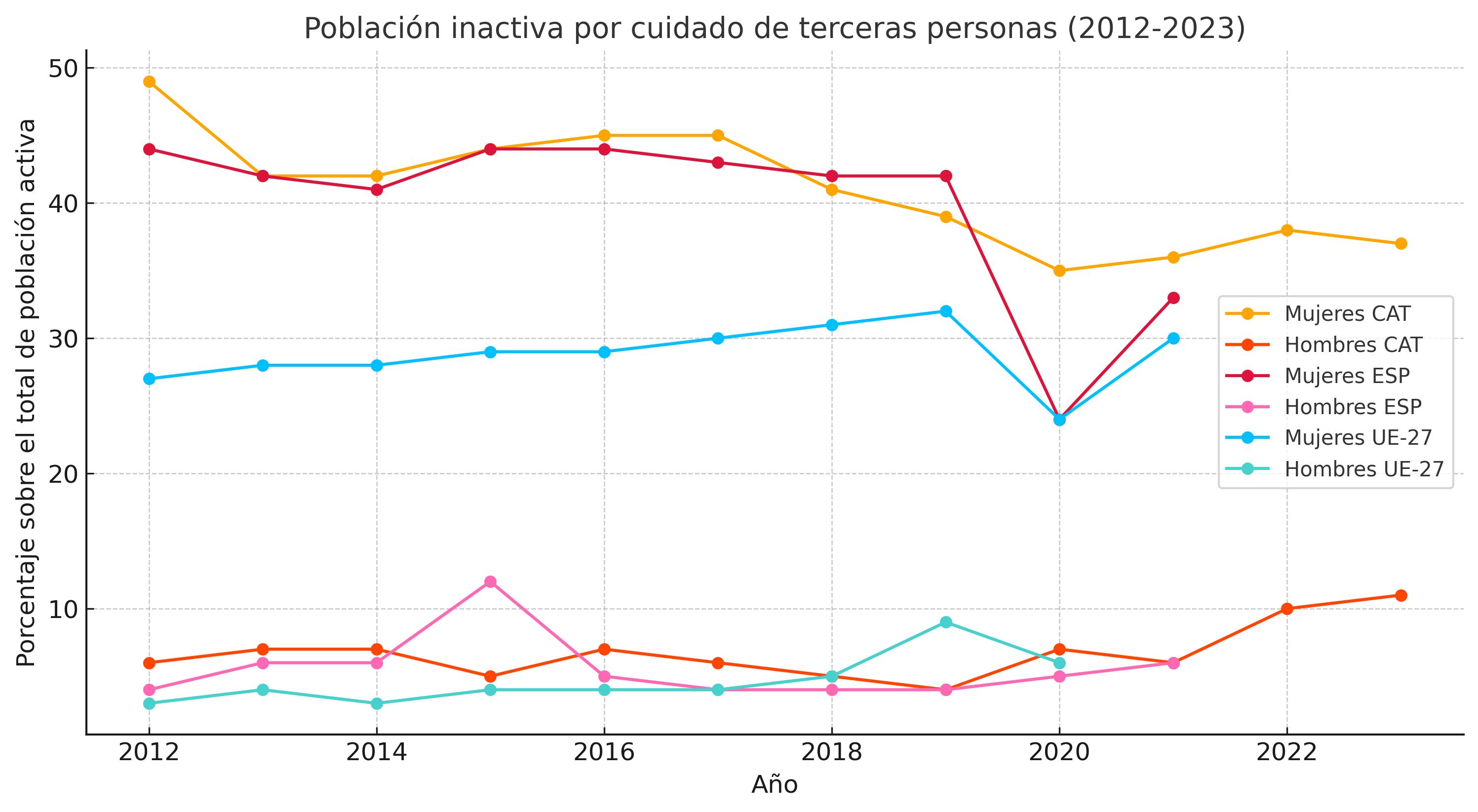 Tal y como se puede ver en los distintos gráficos, existe un sesgo de género entre hombres y mujeres inactivos en el mercado laboral debido al cuidado de terceras personas. En concreto, en el año 2023, el último del que se tienen todos los datos, solo el 11% de los hombres de Cataluña están inactivos por razones de cuidado, mientras que en el caso de las mujeres, el porcentaje es del 37,2%. Este porcentaje está todavía por encima de la media de la UE. La tendencia es creciente entre los hombres, y en este caso, superior a la media europea.