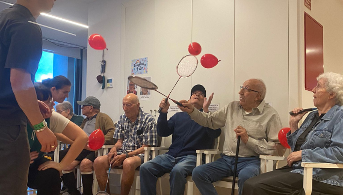 Durante la celebración, las personas de los centros también disfrutaron de una actividad lúdica muy entretenida que consiste en coger al vuelo los globos rojos que se ven en la siguiente fotografía. Los globos, que se elevaban a través del aire de un ventilador, volaban por toda la sala, y las personas atendidas tenían que “cazarlos” al vuelo con una raqueta.